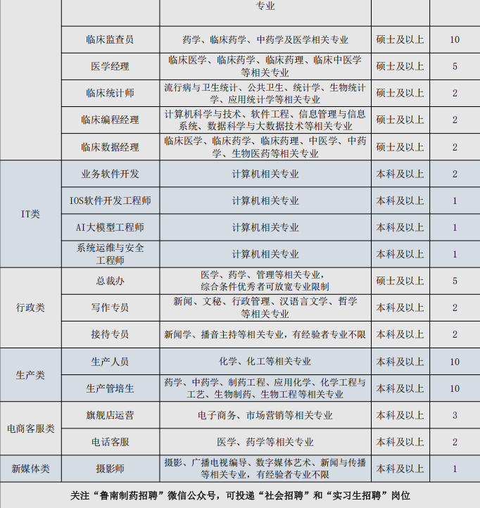 关注微信公众号鲁南制药招聘—加入鲁南—校园招聘/社会招聘/实习生招聘,在线报名