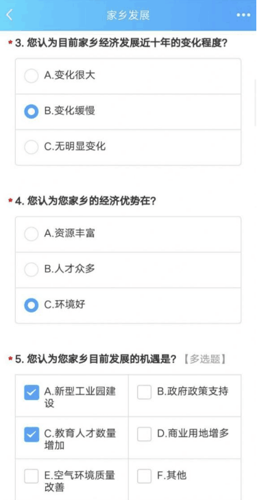 志愿者针对家乡的发展情况分别从家乡经济发展机遇、发展方向以及家乡发展变化情况等方面通过线上调查问卷的方式展开调研。调查结果表明,近年来家乡的发展对当地生活的改善不仅体现在交通更加便利、饮食习惯更加科学,在一百份的问卷当中过半人数表示医疗养老保险和休闲活动也得到了完善与丰富。对于家乡的经济发展目前存在的动力不足的问题志愿者们也进行了调研探究,发现与以往的经济发展方式相比,现如今制约大部分地区经济持续性发展的主要元素首要是创新,由于创新形式和创新性政策的缺乏,造成就业方式的缺失,进而制约经济发展动力。随着如今的科学技术迅速的发展,经济发展与科技的关系越来越密切,经济持续性的发展离不开科学技术的支持,创新便成为影响科学技术发展和经济发展的重要前提。综上结果,志愿者们为家乡发展提出当地政府出台符合当前形势的政策、企业部门不断创新吸引人才的参考建议。此次调研,受访者对家乡发展中教育学费的减免和工资收入的方面也提出了期许。
