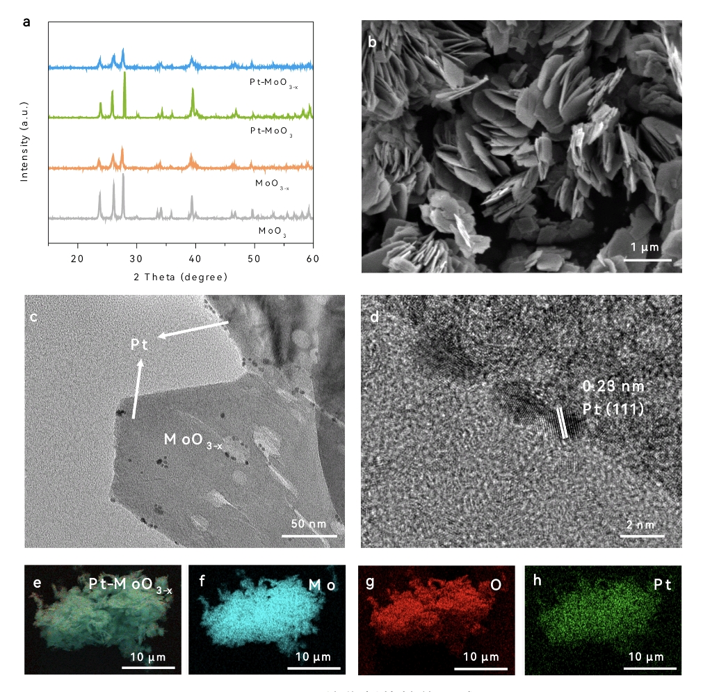 本研究利用丰富的Mo(V)物种和Pt的协同作用,在室温光催化固氮反应中,实现了高效光驱动合成氨速率(3456 μg∙g-1∙h-1)。实验和理论证明,光催化性能的提高可归因于构建双活性位点,负载Pt助催化剂使氢活化位点(Pt-O桥)和氮活化位点(低价Mo物种)之间的H*迁移能垒低,可促进OV诱导的氢从Pt向MoO3-x溢出,进一步增加Mo(V)活性位点的数量。而邻近氧空位的Mo(V)物种具有出色的给电子能力和较强的氮化学吸附性,在促进氮解离方面发挥了关键作用。