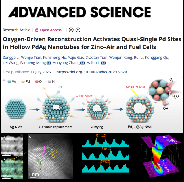 近日,9728太阳集团李海波团队揭示了界面氧原子能够改善临近Pd原子的局部电荷密度和能带结构,可以高效驱动电催化氧还原反应,相关研究以《氧元素激活空心PdAg纳米管中的钯原子位点应用于锌空气电池和燃料电池》(Oxygen-Driven Reconstruction Activates Quasi-Single Pd Sites in Hollow PdAg Nanotubes for Zinc-Air and Fuel Cells)为题发表在国际顶尖学术期刊《尖端科学》(Advanced Science)(中科院1区,IF = 14.1)。该期刊是跨学科的高影响力期刊,专注于材料科学、化学、生物科学和工程领域的创新研究。