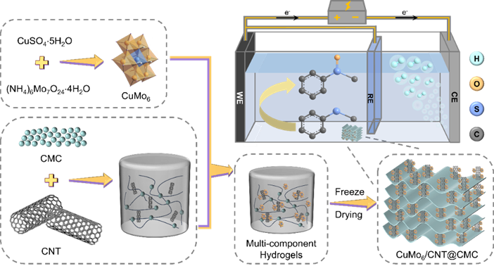 电化学合成高附加值化学品在推动绿色化工和可持续发展方面具有重要地位,可为实现国家“双碳”战略目标提供技术支撑。亚砜为一种用途广泛的有机硫化物,在药物化学、材料科学和天然产物合成中应用广泛。迄今为止,在硫化物的氧化反应中通常用到O2、H2O2、间氯过氧苯甲酸、CrO3、NaIO4和KMnO4等氧化剂。然而,这些策略仍然面临着诸多障碍: (1)、强氧化剂的引入和有毒废物的排除; (2)、催化效率低(< 50%)且难回收; (3)、工艺复杂繁琐,解决以上问题的关键在于催化剂的选择。团队成员设计了一种多钼氧簇气凝胶电催化剂的合成方案,通过碳纳米管调节多钼氧和泡沫之间的微环境,极大地提高了复合催化剂的电催化活性,实现了有机硫化物的高效选择性氧化。