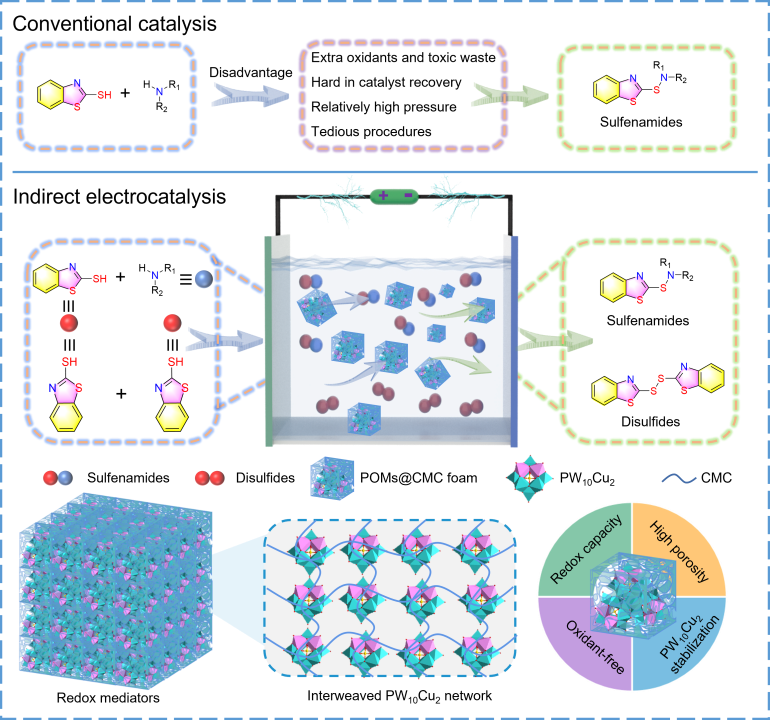 本工作针对传统热催化合成橡胶助剂等功能有机分子过程中存在的使用贵金属催化剂和反应步较为骤繁琐等问题,首次制备了系列具有可调负载量的二铜取代多金属氧簇泡沫催化剂,在次磺酰胺和二硫化物的间接电催化合成以及高效产氢方面表现出优异性能。本研究为开发设计结构新颖、性能优异的多金属氧簇间接电催化合成橡胶助剂开辟了新的道路。