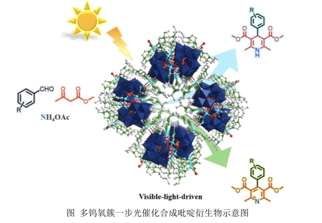 本工作针对传统热催化合成高附加值吡啶化合物过程中存在的使用贵金属催化剂和反应步骤繁琐等问题,设计合成了一种廉价过渡金属自组装而成、具有二重互穿lvt框架结构的锌钨氧簇,并对其进行了详细的结构表征及光化学特性分析,成功实现了在可见光、无额外添加剂条件下一步合成吡啶衍生物的目标,其最优产率可达87%,解决了前期工作中的技术难题。本研究为开发设计结构新颖、性能优异的多金属氧簇光催化剂开辟了新的道路。