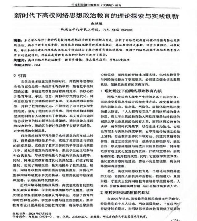 2024年9月,在《教育》公开发表论文《新时代下高校网络思想政治教育的理论探索与实践创新》