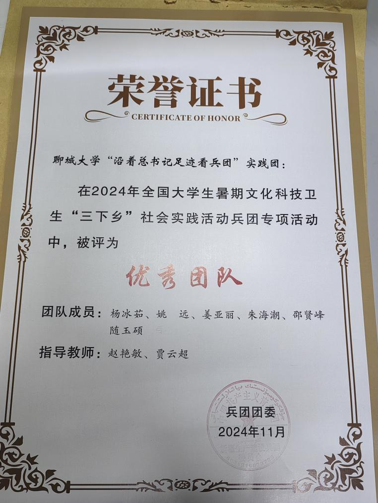 1.太阳成集团tyc9728“沿着总书记足迹看兵团”实践团在2024年全国大学生暑期文化科技卫生“三下乡”社会实践活动兵团专项活动中,被评为“优秀团队”
