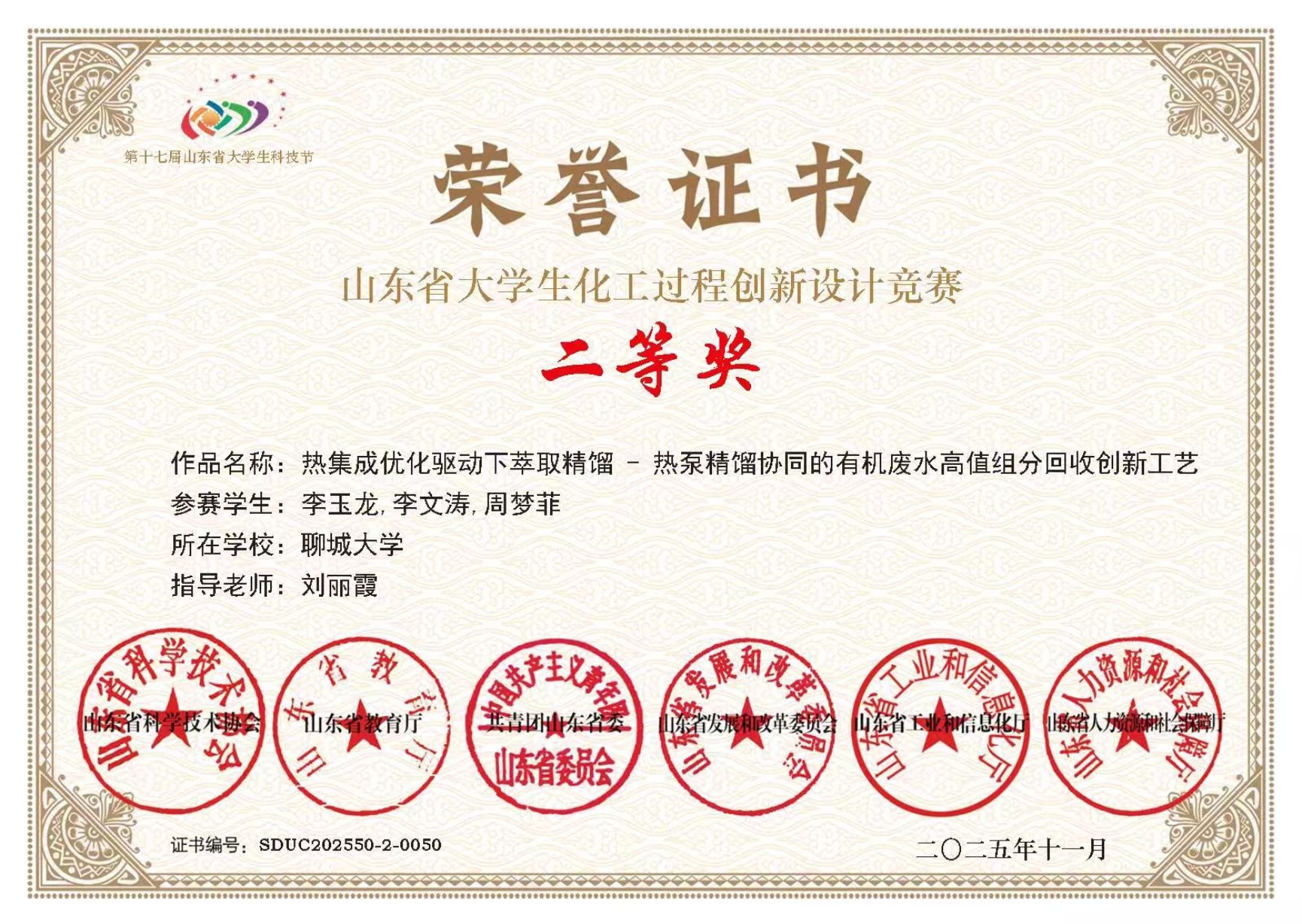 周梦菲 | 山东省化工过程设计创新大赛二等奖 | 2025.11 |