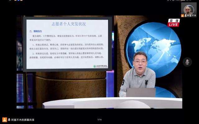 讲座伊始,王教授从专业角度深入细致地为大家讲授了目前新型冠状病毒变异情况、传播途径,并分析研判了当前疫情防控形势,通过列举部分地区不重视疫苗注射而造成确诊病例激增的案例,呼吁大家主动、积极地进行疫苗注射,为自己、为他人撑起一把保护伞。王刚教授着重讲授了新冠肺炎的预防措施,其中包括口罩使用指南、消杀等基础防护知识,以及如何正确穿脱防护服、怎样减少意外伤害等志愿者自护知识。他表示,掌握应急处理及自护知识是极为必要的,只有做好自身防护才能更好地服务他人。为帮助志愿者进一步提高综合素质,王刚教授从突发状况应急处理、志愿规范、情绪处理三方面对志愿者工作内容和基本素养进行讲解,针对突发状况的处理,他表示,志愿者应做到镇定沉着,及时上报主管部门,同时应时刻关注服务对象的状况,及时有效地进行防疫处理;在志愿规范方面,志愿者要以身作则,与其他志愿者互相关心,互相鼓励,密切配合,遵守纪律规范,注重仪容仪表,不着奇装异服,用温暖带动每一个人;在情绪处理方面,当服务对象对相关工作不理解时,志愿者应保持冷静,关照服务对象心理,优先进行耐心沟通和讲解,化解矛盾,继续推进相关工作顺利进行,志愿者在志愿服务过程中也应进行积极的心理暗示,努力化解自身工作中的压力,回归简单的心理预期。