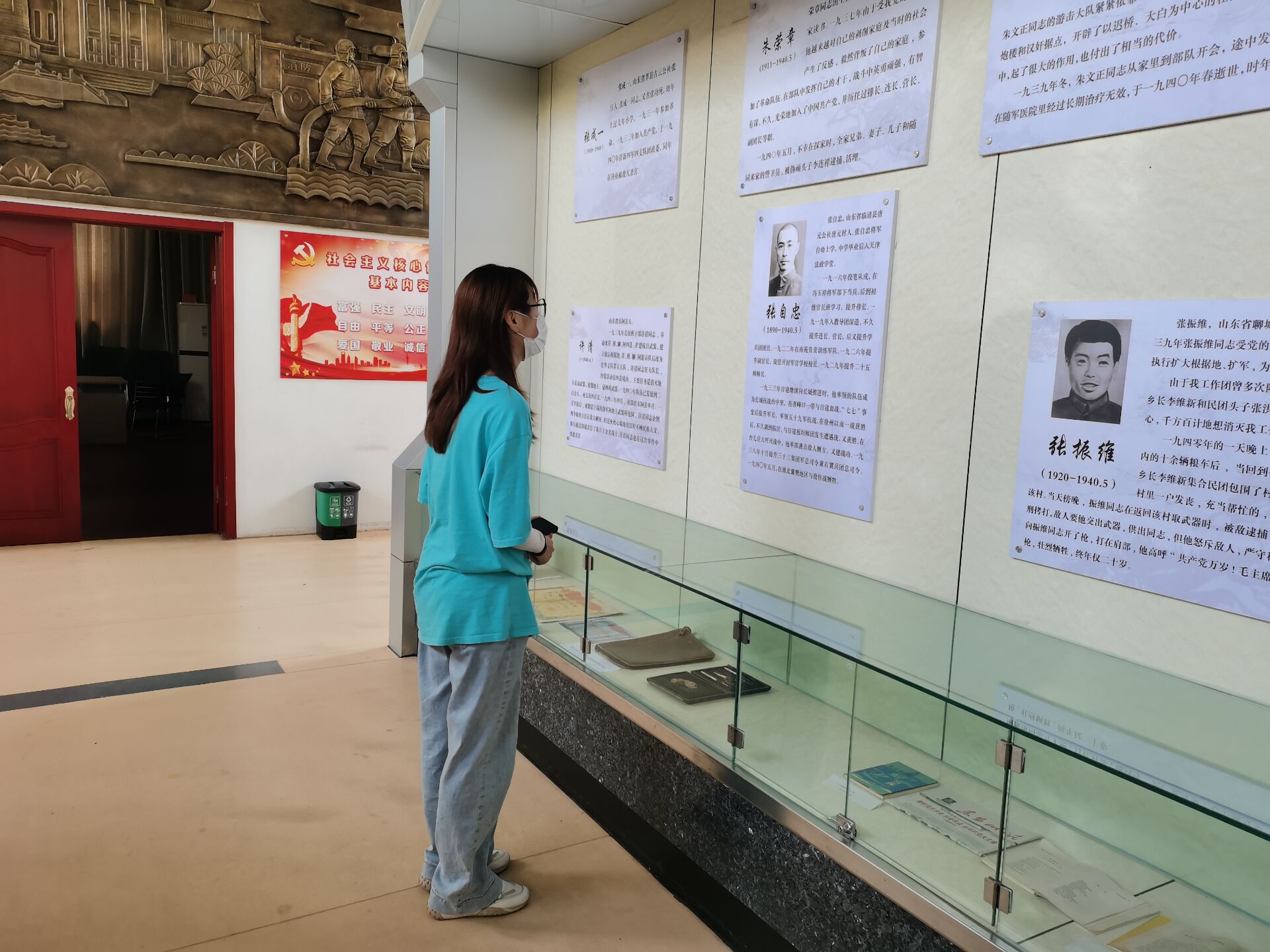 活动伊始,志愿者走进革命烈士纪念馆大门,正中央大理石基座上安放着一座红旗雕塑,高歌颂扬革命先烈的丰功伟绩,在雕塑前对革命先烈进行哀悼,表达对革命先烈的深切缅怀之情。随后,志愿者参观纪念馆,周恩来总理所提“革命烈士永垂不朽”八个大字熠熠生辉,大厅内陈列有周厚成、王振杰、王杰江等224名烈士事迹和部分遗物,一封封烈士的家书、一本本泛黄的日记、一篇篇当年发表的文章令志愿者们为之驻足,而一段段滚烫的誓言更是格外醒目,大厅左右两侧的铸铜雕塑再现了“1947年刘邓大军渡黄河”与“1928年阳谷坡里暴动”的战斗场景,悬挂于大厅两侧的锻铜浮雕展现了民族独立、祖国解放和社会主义建设时期英雄群体人物的风采。烈士陵园内,青松挺拔,气氛肃穆,在讲解员的引导下,志愿者们重温革命先烈浴血奋战的感人事迹,近距离感受红色岁月中的革命情怀。参观过程中,志愿者们手捧菊花,向英雄纪念碑深深鞠躬以表达哀思,深切感受到中国共产党艰苦卓绝、波澜壮阔的奋斗历程,体会到在中国革命和建设征途中形成的“红色文化”精髓。