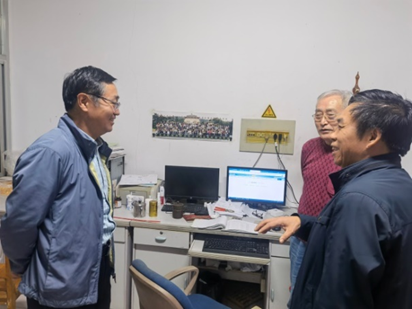 在X-射线单晶衍射实验室,关延平同王大奇老师亲切交谈,称赞王大奇老师退休不退岗,积极发挥余热,退休十多年来始终坚持在实验室为师生科研服务。