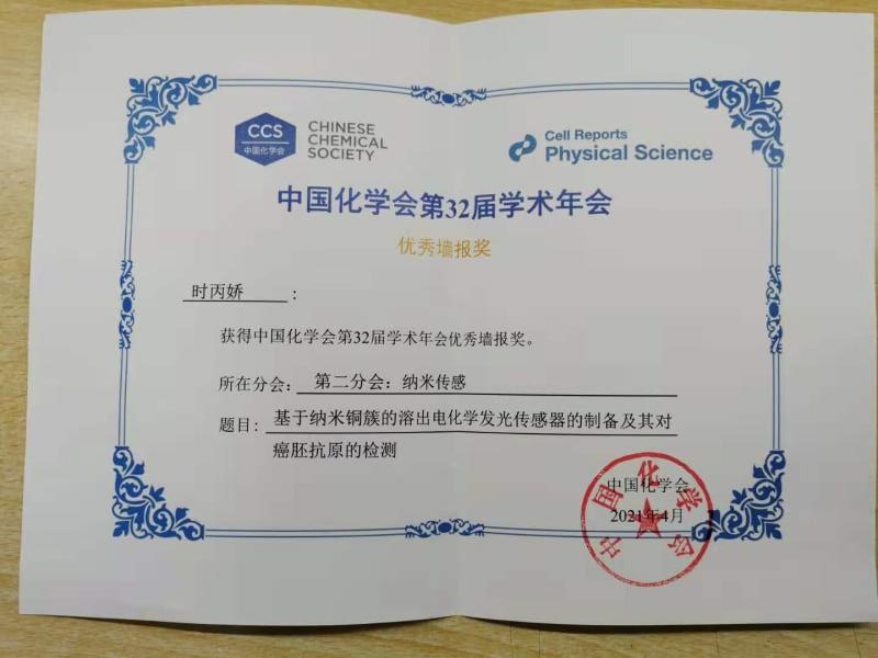 在刚刚结束的中国化学会第32届学术年会上,9728太阳集团王怀生老师指导的2019级分析化学专业研究生时丙娇同学荣获第二分会(主题:纳米传感)优秀墙报奖。