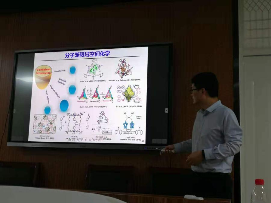 孙庆福研究员主要介绍了两方面的工作。第一种是过渡金属有机大环/笼,过渡金属主要是Pd元素,阴离子受体的诱导配合自适应组装。第二个是功能性稀土元素,包括稀土金属配合物的多配位,稀土配位超分子多面体的发光调控等。孙老师学识渊博,给大家带来了开阔视野、启发思想的分享。他的报告既有广度也有深度,引发了参会师生的热烈讨论。