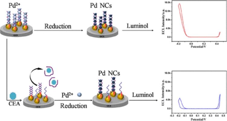 本研究发现在鲁米诺-过氧化氢这一发光体系中,以DNA双链为模板制备的钯纳米簇一方面可以猝灭鲁米诺在高电位下的阳极发光,另一方面可以促进鲁米诺在低电位下产生阴极发光。基于此,我们以鲁米诺为单一发光体,以过氧化氢为单一共反应剂,制备了双电位比率型的电化学发光传感器,并将其用于人体血清中癌胚抗原的灵敏检测,其结果与临床值符合良好,证明了制备的传感器在临床实际检测中的潜力。