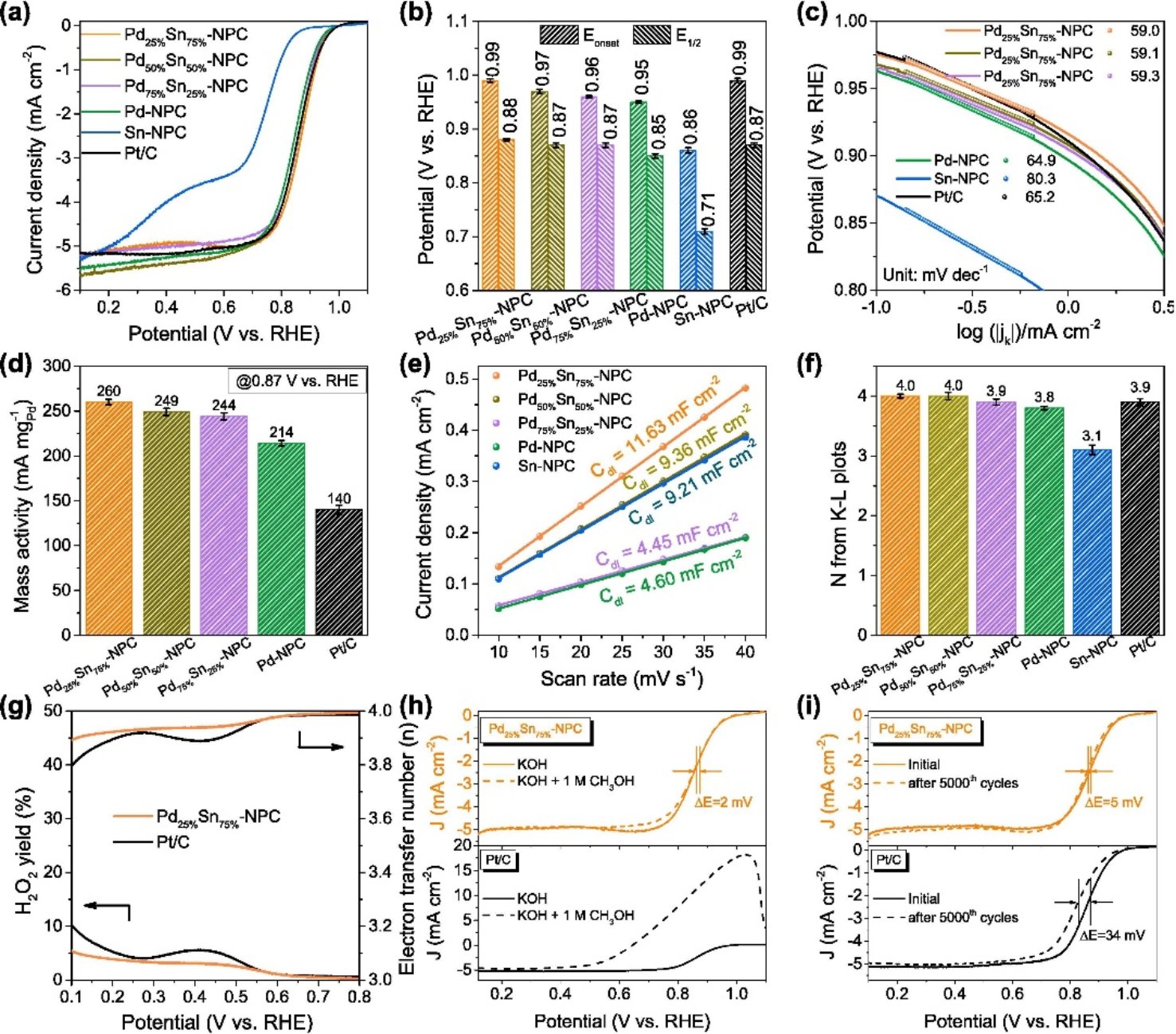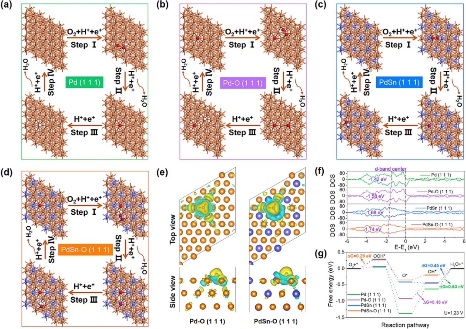 综上所述,通过直接在预制碳基底上采用一步法还原Pd/Sn金属盐,成功制备了大量氧原子修饰的PdSn合金界面,并证实了界面氧原子修饰显著提高了氧还原反应活性。此外,研究还通过密度泛函理论计算揭示了氧原子修饰对Pd-Sn界面位点的电子局域分布影响,深度揭示ORR性能增强机制,为设计更高效的催化剂提供了新思路。
