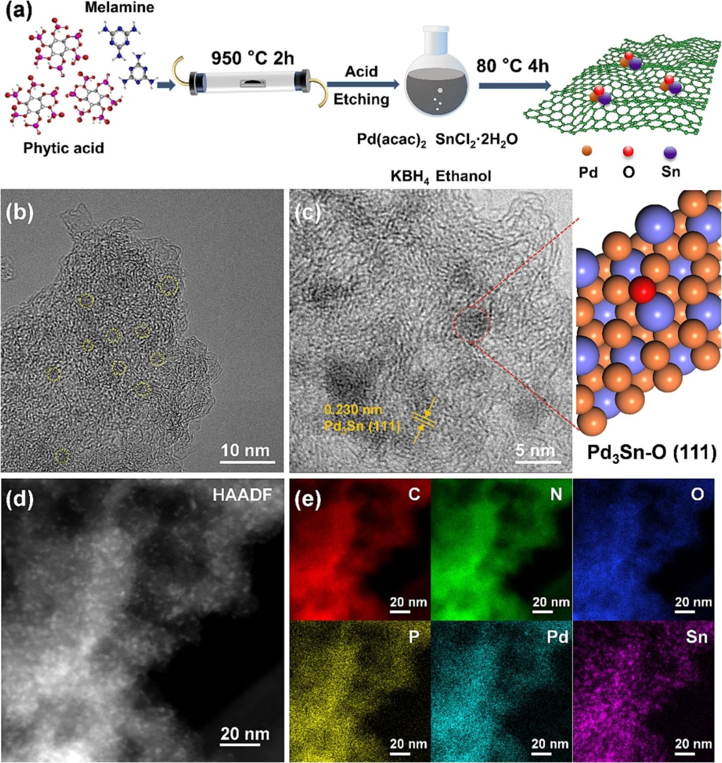 李海波课题组通过构筑钯锡(PdSn)合金催化剂并选用氮、磷掺杂碳(NPC)作为基底,实现了高效ORR催化剂的制备。具体实验过程采用直接还原Pd/Sn金属盐物种,制备了大量氧原子修饰的PdSn合金界面。在NPC基底中预嵌入的Pd/Sn金属盐物种控制了金属源在液相还原中的释放,促使PdSn合金催化剂具有诸多优点,如高效电子传导、短程结晶和暴露面积增大的晶体界面等。通过粉末X射线衍射、高分辨透射电子显微镜和X射线光电子能谱表征,系统验证了NPC基底上小尺寸PdSn合金界面存在大量的氧原子。最优催化剂(PdSn-O)在氧饱和的0.1 M KOH中,实现了活性起始电位为0.99 V和半波电位为0.88 V的氧还原电催化性能。将其组装为锌空气电池,表现出高达218.9 mW cm-2的高比功率和810.6 mAh gZn-1的高比容量。