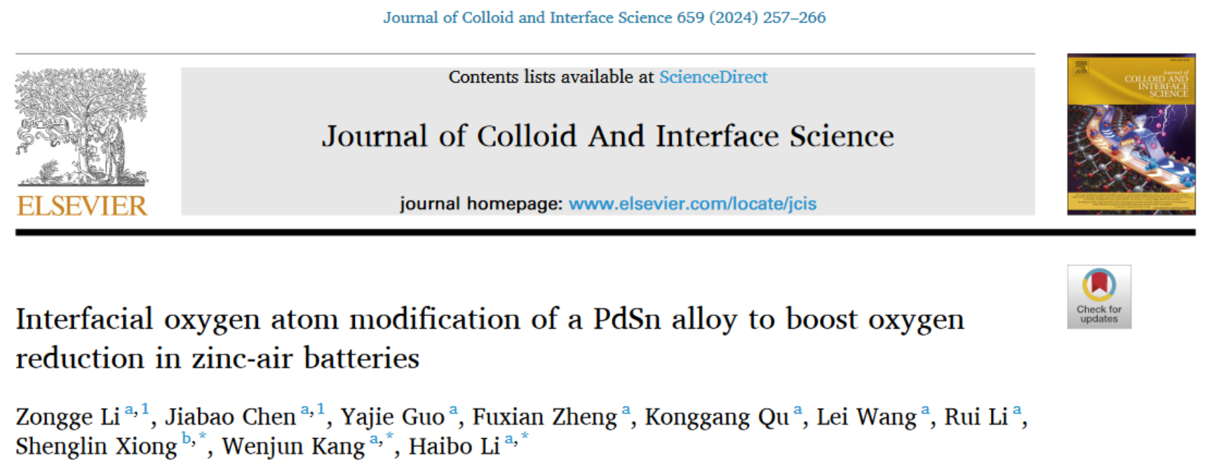 Journal of Colloid and Interface Science | 太阳成集团tyc9728李海波课题组揭示氧原子改性PdSn合金界面以促进锌空气电池中的氧还原反应