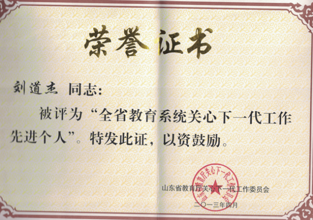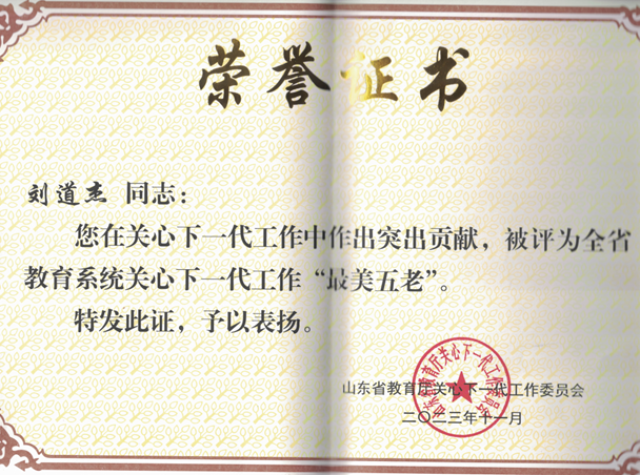 2023年11月,山东省教育厅关心下一代工作委员会发布了《关于表扬全省教育系统关心下一代工作“最美五老”的通报》(鲁教关委〔2023〕3号),表扬137名同志为全省教育系统关心下一代工作“最美五老”,我院退休教师刘道杰同志获此殊荣。